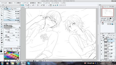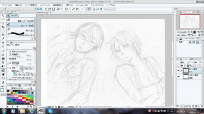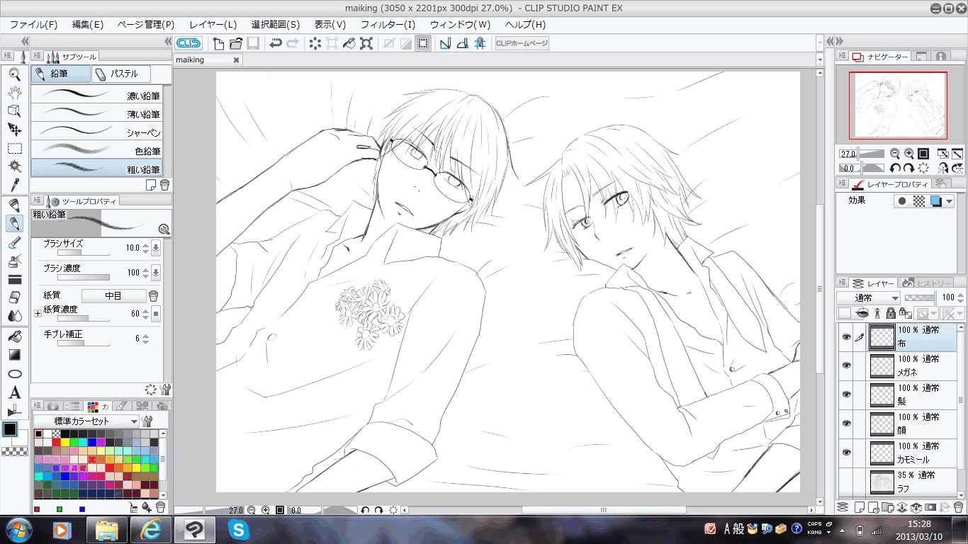 あとはレイヤーを部位ごとにわけてざくざくペン入れ。今回はアナログ感をだしたくて「粗めの鉛筆」ツールを使ったんですが、印刷物だったらけっこうわかるんだけど、画面上だとあんまり普通のペンとかわらないっていう。拡大してみるとちゃんと鉛筆っぽいんですよ!!とここでいらん主張しとく。