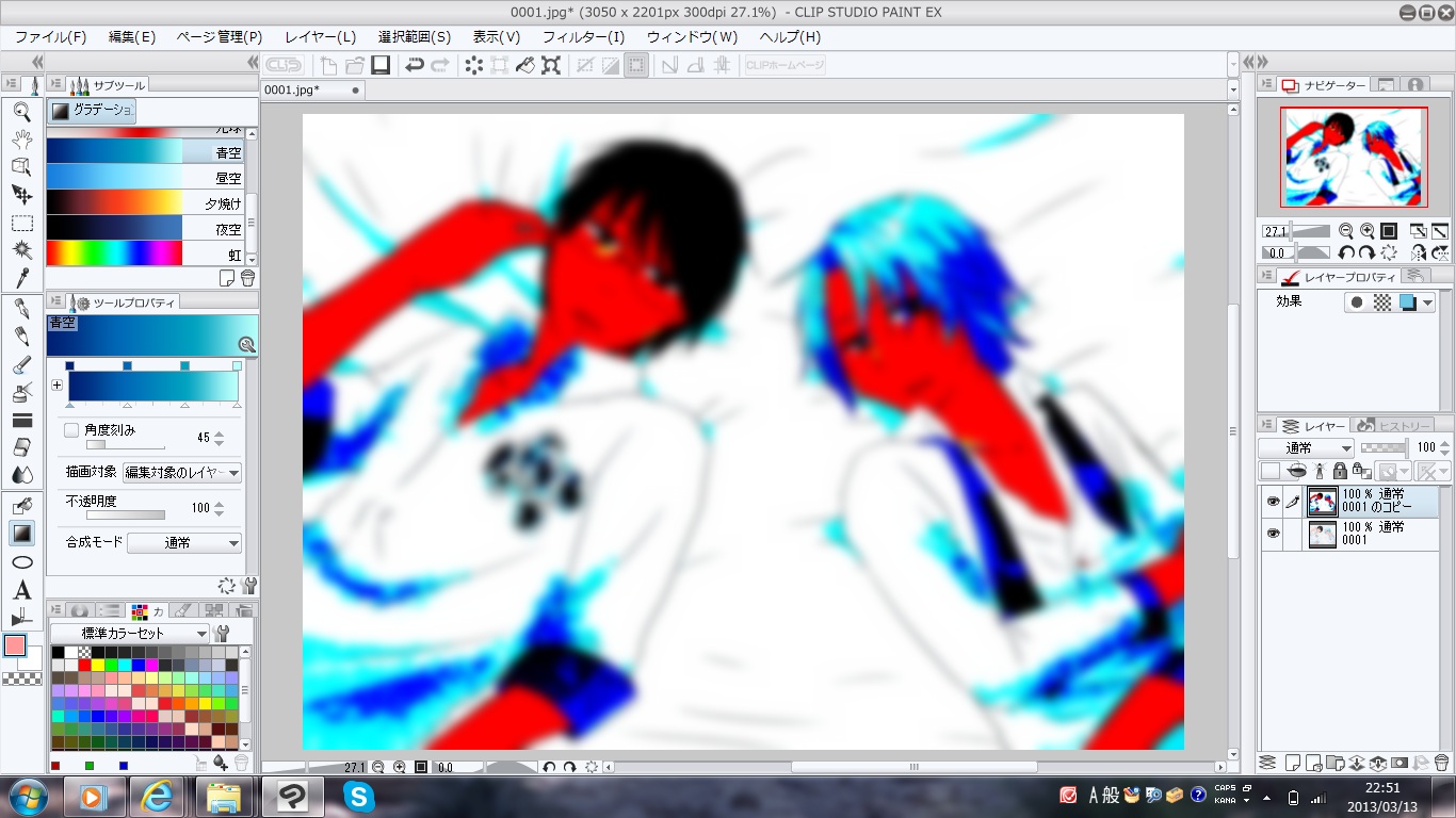 あんだけくっきり影を塗っておいてあれですが「もっとふんわりした感じが出したい」という我儘がここにきて出てきました。ガウスぼかし使って、全体的に影をぼんやりさせます。