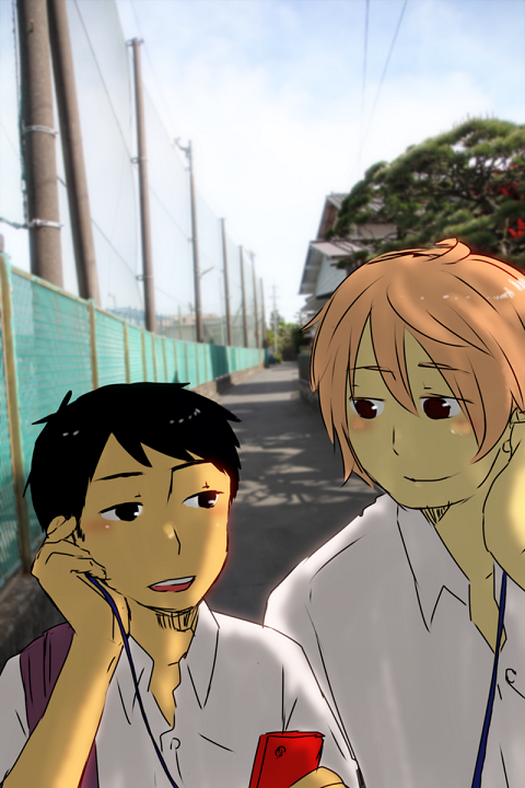夏の通学路で気に入った音楽を安住君に紹介してる吉田君。