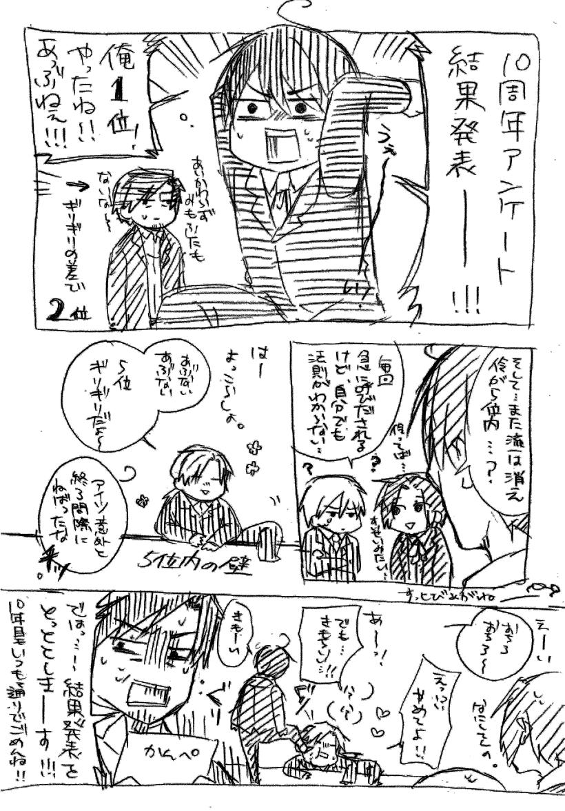 昨年の移動にみなさん反省したのか票が無事にもどってきたので、1位だったよ!やったね!江戸さん!!そして、何年かに一度ある謎の伶ちゃんの上位入り。10周年でも謎の奇跡が起きたよ伶ちゃん。兄は相変わらずなんでこんなはみ出ちゃうかな!?